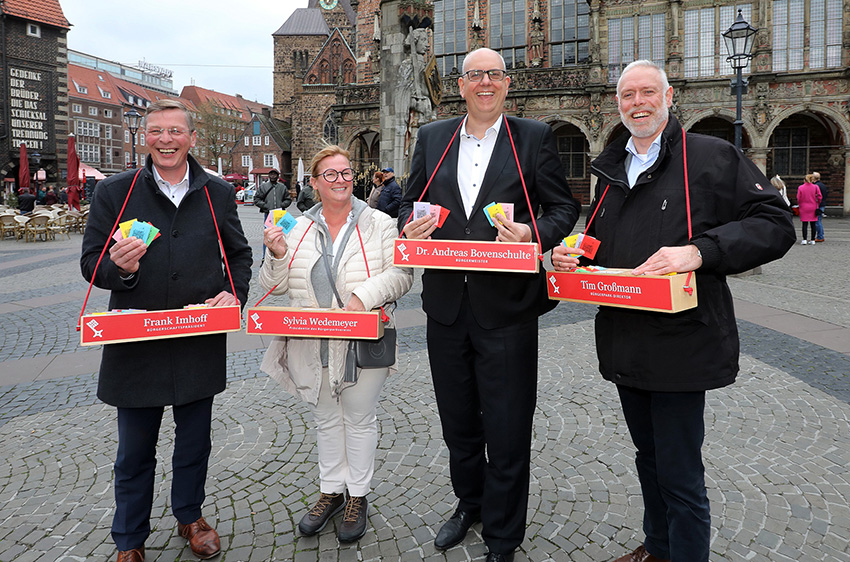 Die Losverkäufer/Innen der Bürgerpark-Tombola bekamen auch in diesem Frühjahr wieder „prominente" Unterstützung: Bei Bremer Wetter konnten heute Bürgermeister Andreas Bovenschulte, Präsident der Bremischen Bürgerschaft Frank Imhoff , die Präsidentin des Bürgerparkvereins Sylvia Wedemeyer und Bürgerparkdirektor Tim Großmann ganz viele der begehrten bunten Tombola-Lose an die Frau bzw. den Mann bringen.
