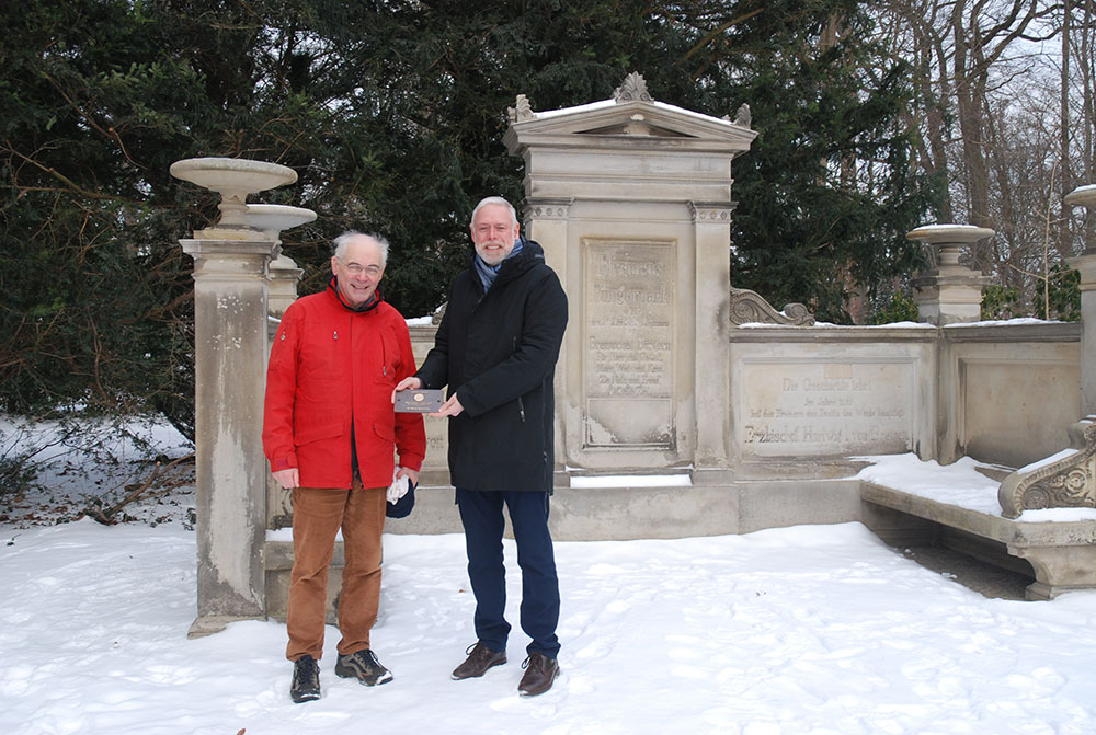 Am Dienstag, den 03. Februar 2026 überreichte Herr Dr. Seibert, Leiter des Ortskuratorium Bremen der Deutschen Stiftung Denkmalschutz, dem Bürgerparkdirektor Tim Großmann die Spenderplakette der Deutschen Stiftung Denkmalschutz, welche in Kürze neben der frisch sanierten Emmabank ihren Platz erhalten soll.